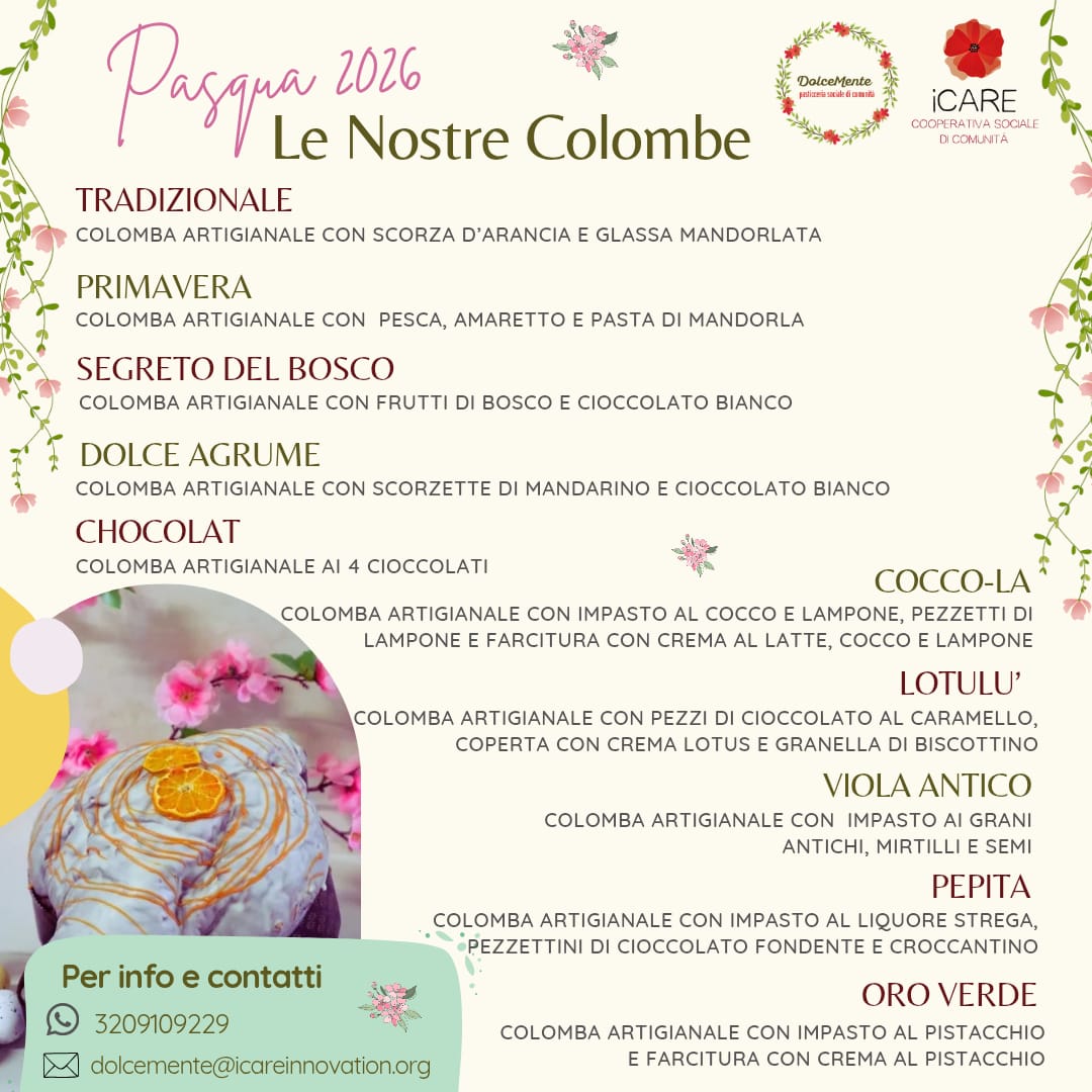 Dopo il fruttuoso periodo natalizio, che ha regalato alla cooperativa sociale di comunità iCare dei “numeri” sempre più incredibili in termini di crescita riguardo la produzione e la vendita dei panettoni artigianali e dei prodotti dolciari natalizi (basti pensare che negli ultimi 4 anni, il laboratorio di pasticceria sociale DolceMente ha raggiunto il +134% di produzione e vendita e il 100% in più delle spedizioni nelle altre regioni d’Italia e all’estero), la sfida su colombe artigianali e uova di cioccolato è stata lanciata. Manca meno di un mese a Pasqua, e i prodotti dolciari pasquali di iCare fanno già gola e fanno sentire la loro profumata presenza tra cucina, magazzino, punto vendita, e anche solo guardando le foto. L’altissima qualità, l’accurata selezione delle materie prime, la delicatezza nell’impastare e nel farcire delle mani dei partecipanti a DolceMente che, insieme ad operatori e volontari, preparano tutto questo, vengono fatti, come sempre, con cura, competenza e passione. Un’esperienza di gusto unica, che lascerà ancora una volta senza parole. Come per i panettoni, anche per le colombe artigianali ci sarà anche una linea produttiva senza glutine e senza lattosio e senza lattosio.